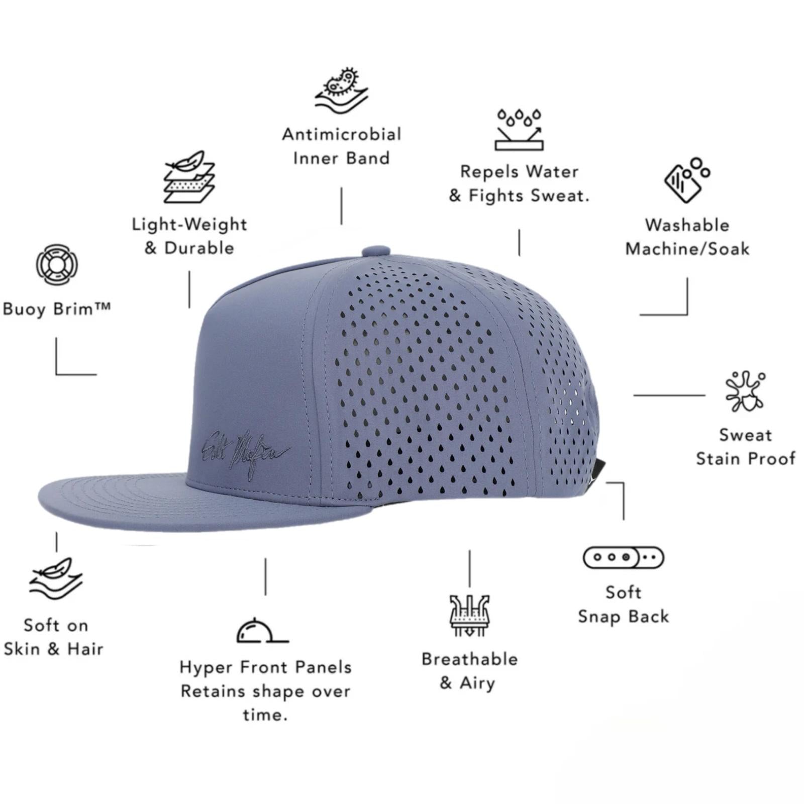 The most comfortable hat you’ll ever wear. Salt Mafia’s snapback was intricately designed by our team to support those who love being active whether on the ocean or on land. A hat created exclusively to adapt to your lifestyle and fit better as you wear it in. The performance hat is super light-weight, floats in water with it's Buoy-Brim™ technology and is water and sweat resistant.