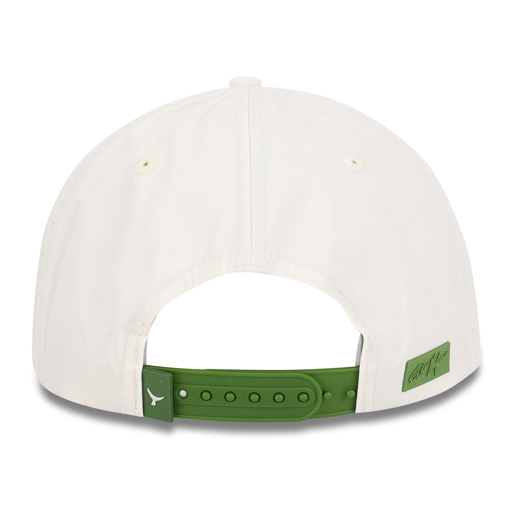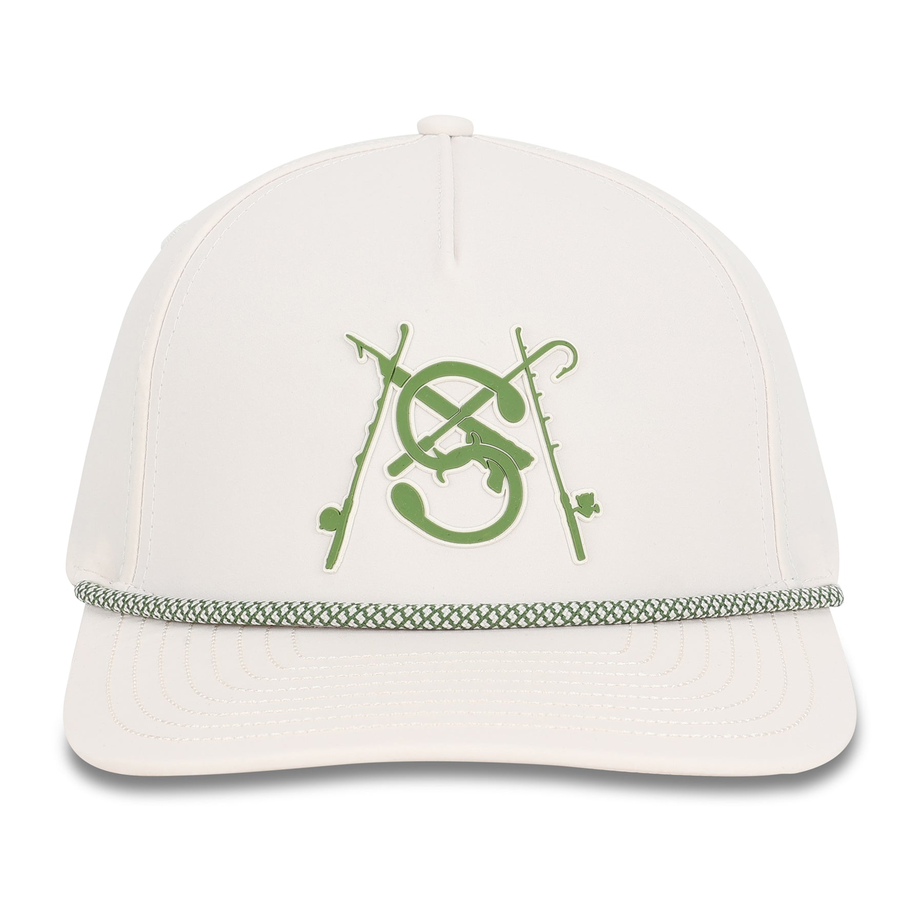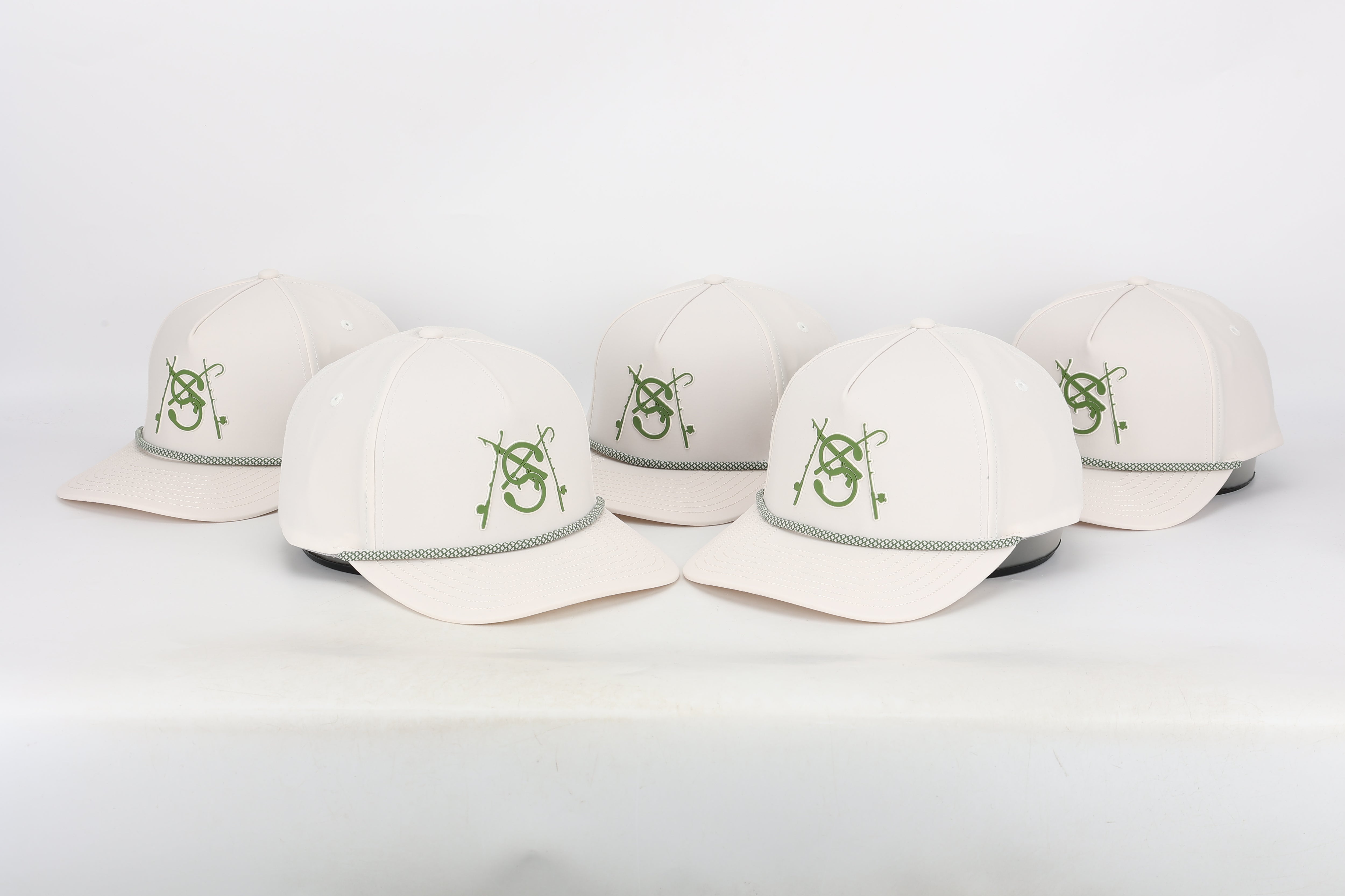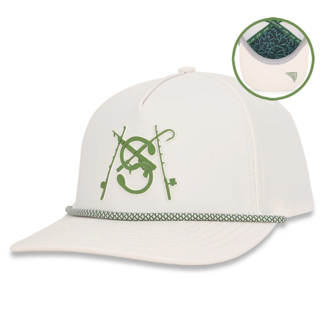 Style: 5 Panel Curved Brim Hat / Off White and Green