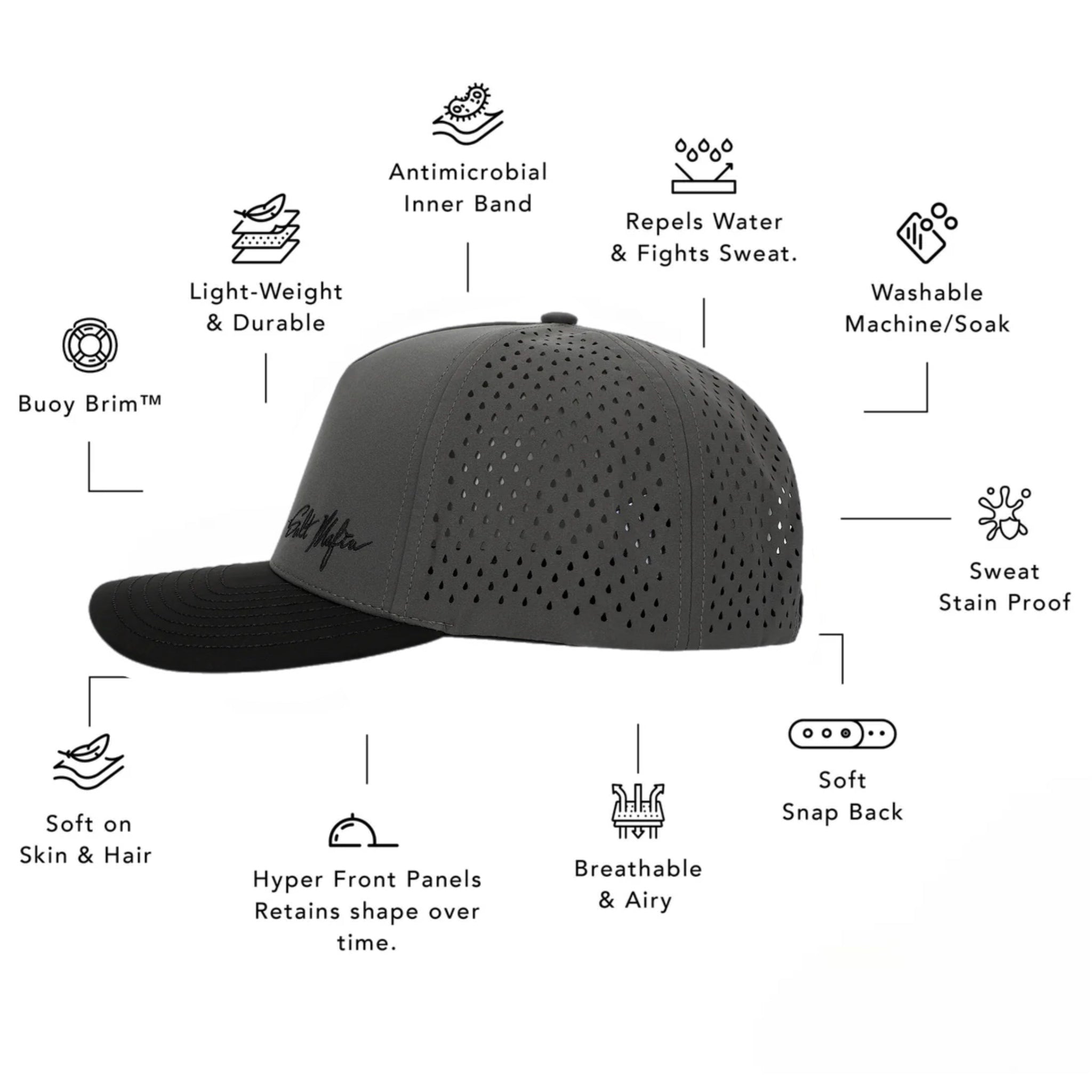 The most comfortable hat you’ll ever wear. Salt Mafia’s snapback was intricately designed by our team to support those who love being active whether on the ocean or on land. A hat created exclusively to adapt to your lifestyle and fit better as you wear it in. The performance hat is super light-weight, floats in water with it's Buoy-Brim™ technology and is water and sweat resistant.