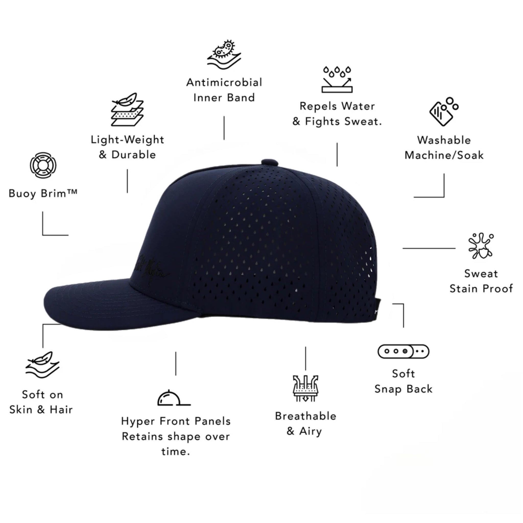 The most comfortable hat you’ll ever wear. Salt Mafia’s snapback was intricately designed by our team to support those who love being active whether on the ocean or on land. A hat created exclusively to adapt to your lifestyle and fit better as you wear it in. The performance hat is super light-weight, floats in water with it's Buoy-Brim™ technology and is water and sweat resistant.